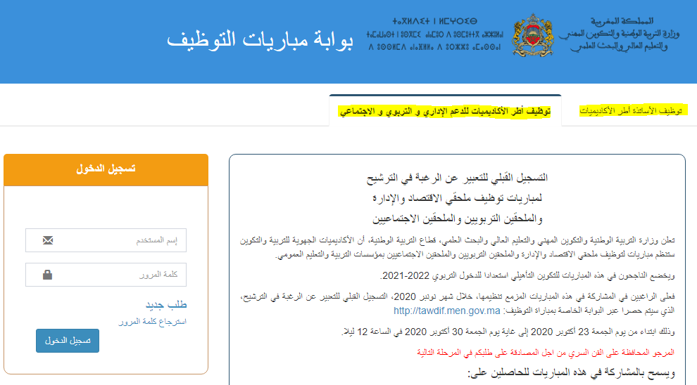 - التسجيل القبلي للتعبيرعن الرغبة في الترشيح لمباريات توظيف الأساتذة أطر الأكاديميات